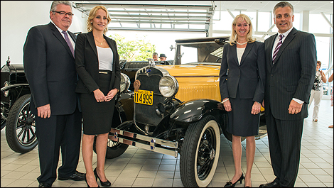 | Bertrand Lessard, directeur général pour la région du Québec chez Ford du Canada, Jennifer Jane Monahan, présidente de Gestion Ray Monahan, Dianne Craig, présidente et chef de la direction chez Ford du Canada, Roger Desautels III, président de Montmorency Ford Lincoln (Photo: Alain Rinfret) |